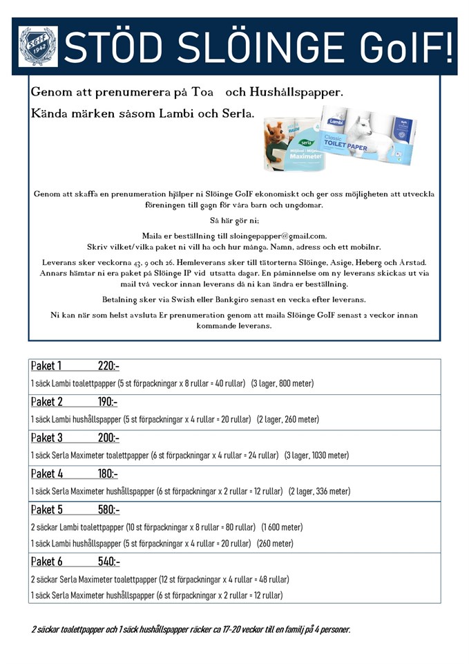 Passa på att stödja föreningen och samtidigt få något som du alltid har nytta av! Nu finns möjligheten att prenumerera på toa- & hushållspapper och få den levererad 3 gånger om året. Slöinge GoIF 23 sep 2020 0kommentarer