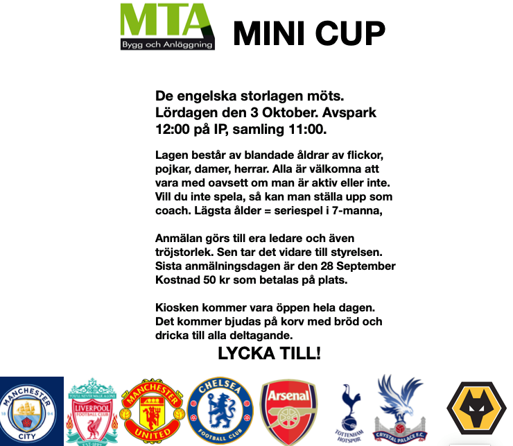 I år avslutar vi utesäsongen med MTA Minicup! Matcher mellan de engelska storlagen. Anmäl er till era ledare! Slöinge GoIF 23 sep 2020 0kommentarer