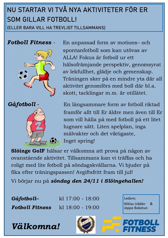 En kul aktivitet som Alla kan vara med på. Sprid detta så kan vi bli ett skönt gäng som lirar lite fotboll och har kul på söndagskvällarna, med start nu på söndag den 24/11. "Kom loss och sparka med oss!" Styrelsen Slöinge GoIF Slöinge GoIF 20 nov 2019 2kommentarer