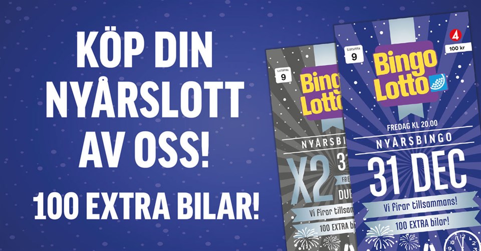 På Matöppet i Slöinge kan du köpa Slöinge GoIF:s lotter till Nyårsbingot. Välj mellan bingolott X1 eller X2. Den vanliga bingolotten, enkellotten, kostar 100 kronor och bingolott X2, eller dubbellotten som den också kallas, kostar 200 kronor och ger dig dubbla vinsten på din lott. Vinner du 1 bil, får du helt enkelt 2! BingoLottos Nyårsbingo sänds traditionsenligt den 31 december. Här kan du läsa om tiderna du bör hålla koll på under kvällen och vad du absolut inte får missa! Till Bingolotto.se